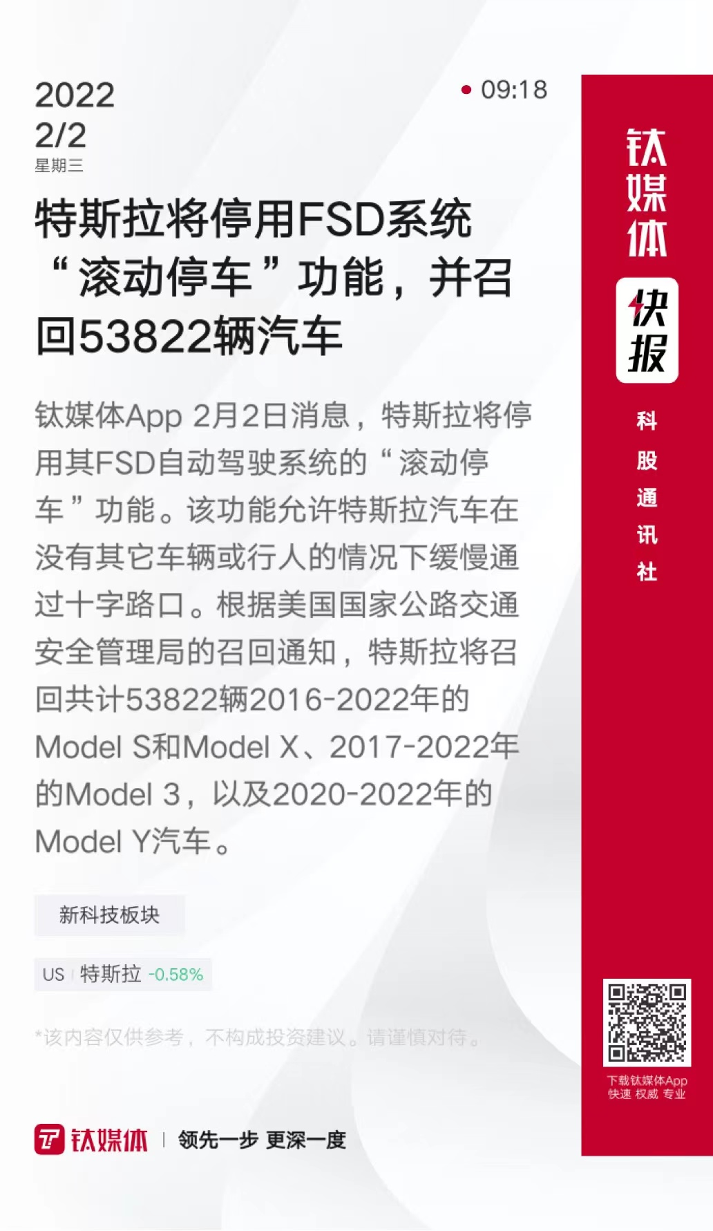 特斯拉将停用FSD系统“滚动停车”功能,并召回53822辆汽车
