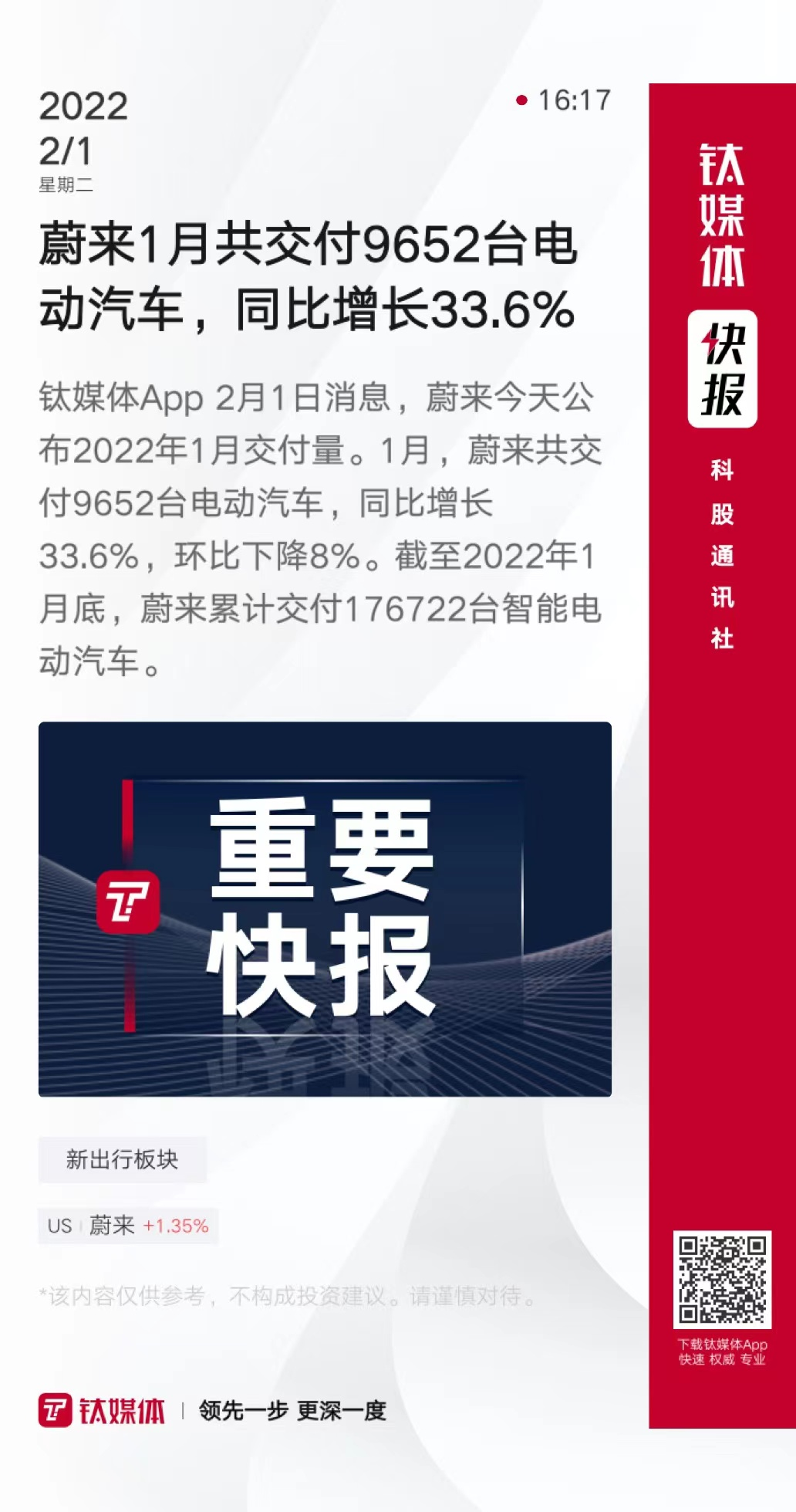 蔚来1月共交付9652台电动汽车,同比增长33.6%