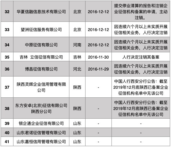 √截至2020年末,我国共有41家企业征信机构已注销,其中有25家因业务调整,主动申请退出企业征信业务备案,有6家因连续六个月以上未实质开展征信相关业务而注销,其他原因注销公司有10家。
