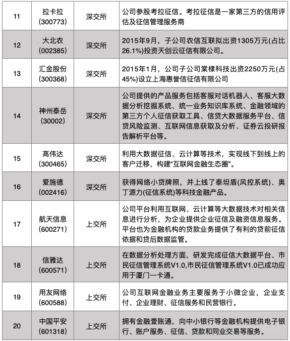 目前我国一共有20家征信概念上市公司,其中4家在上交所,另外16家征在深交所。