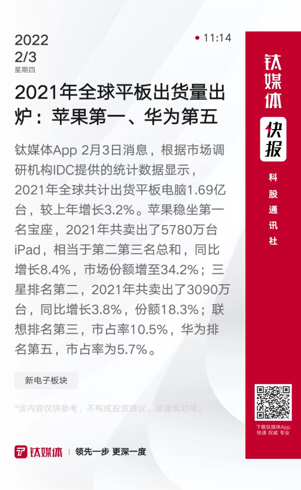 2021年全球平板出货量出炉:苹果第一、华为第五