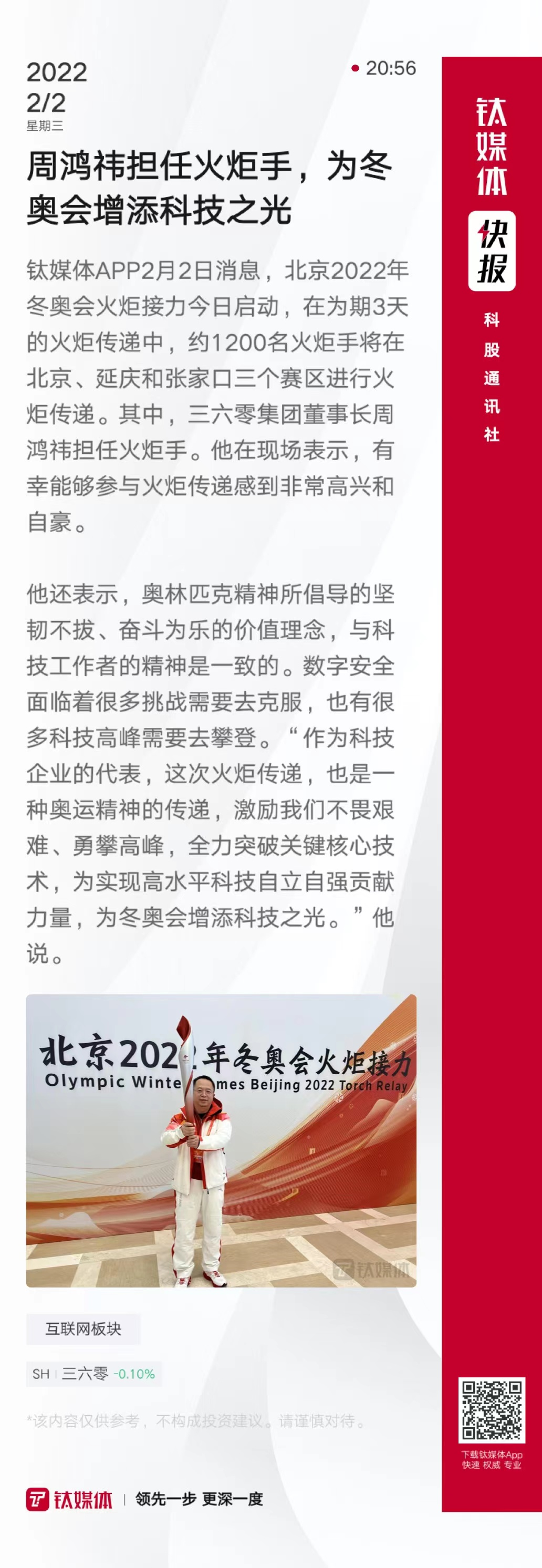 周鸿祎担任火炬手,为冬奥会增添科技之光