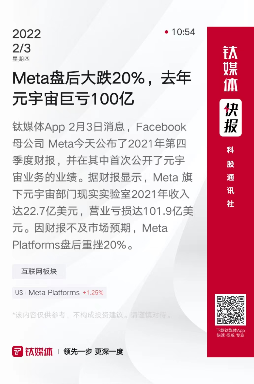 Meta盘后大跌20%,去年元宇宙巨亏100亿