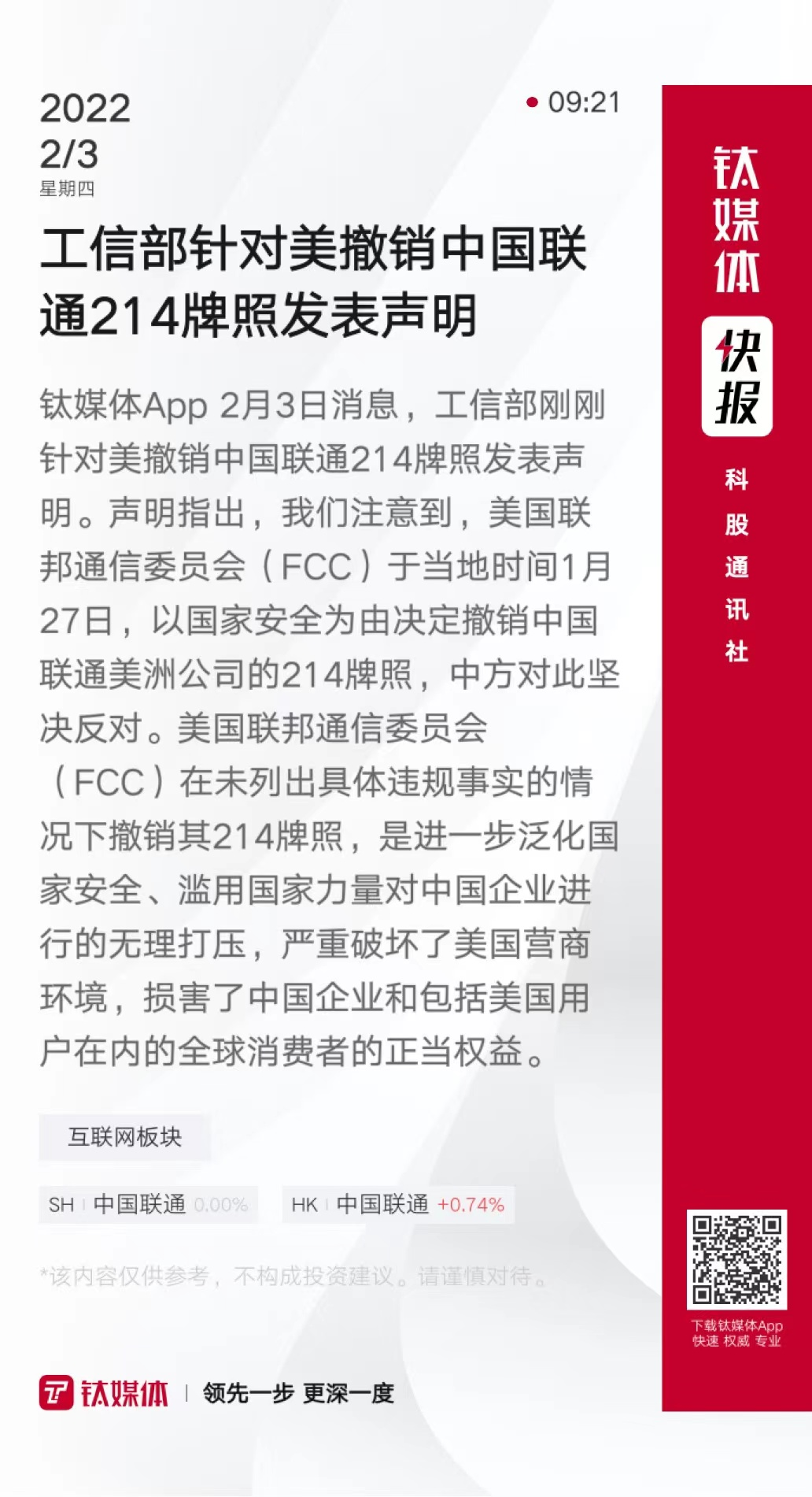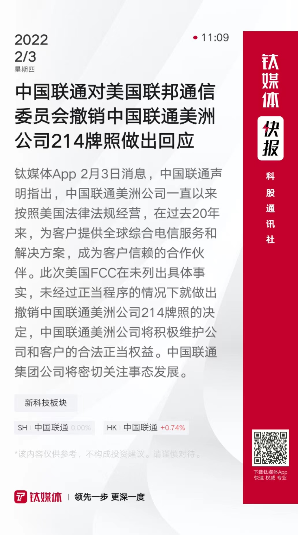 中国联通对美国联邦通信委员会撤销中国联通美洲公司214牌照做出回应