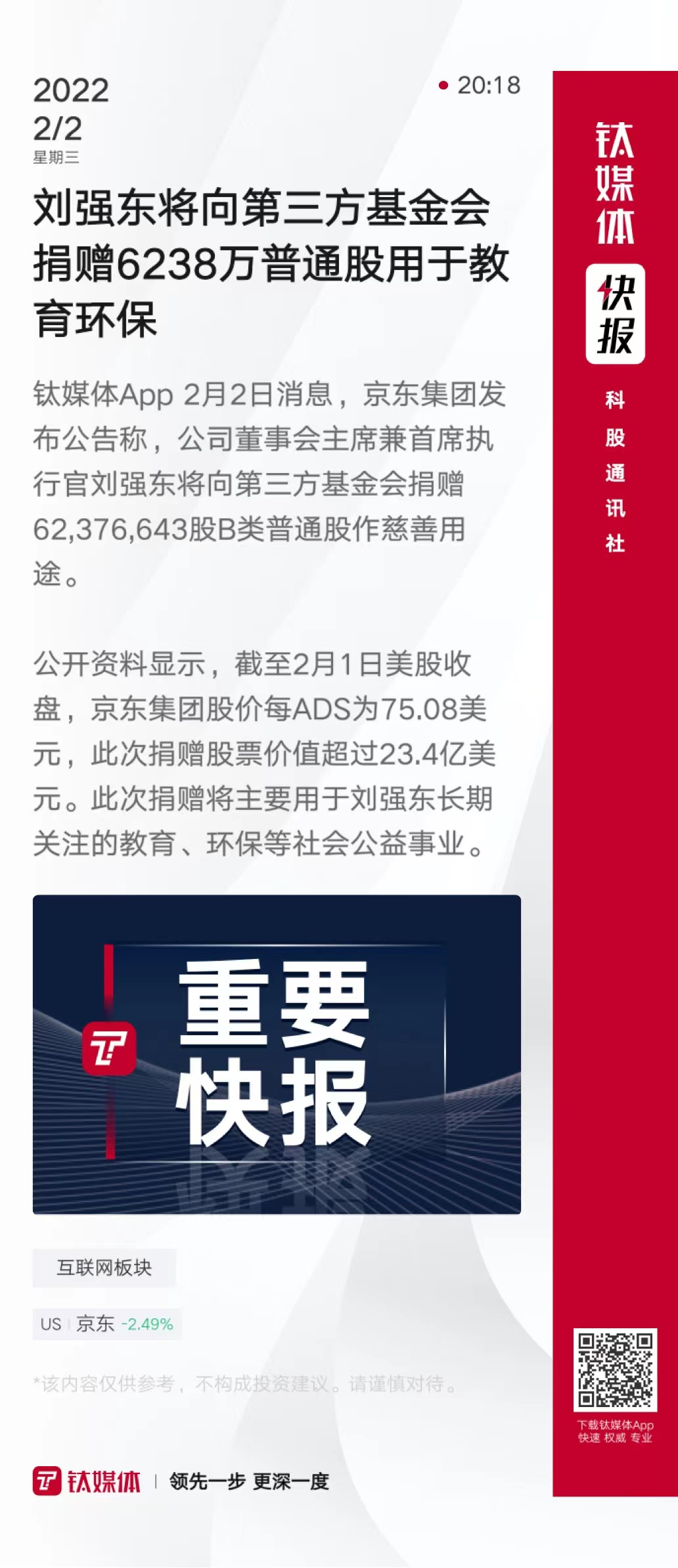 刘强东将向第三方基金会捐赠6238万普通股用于教育环保
