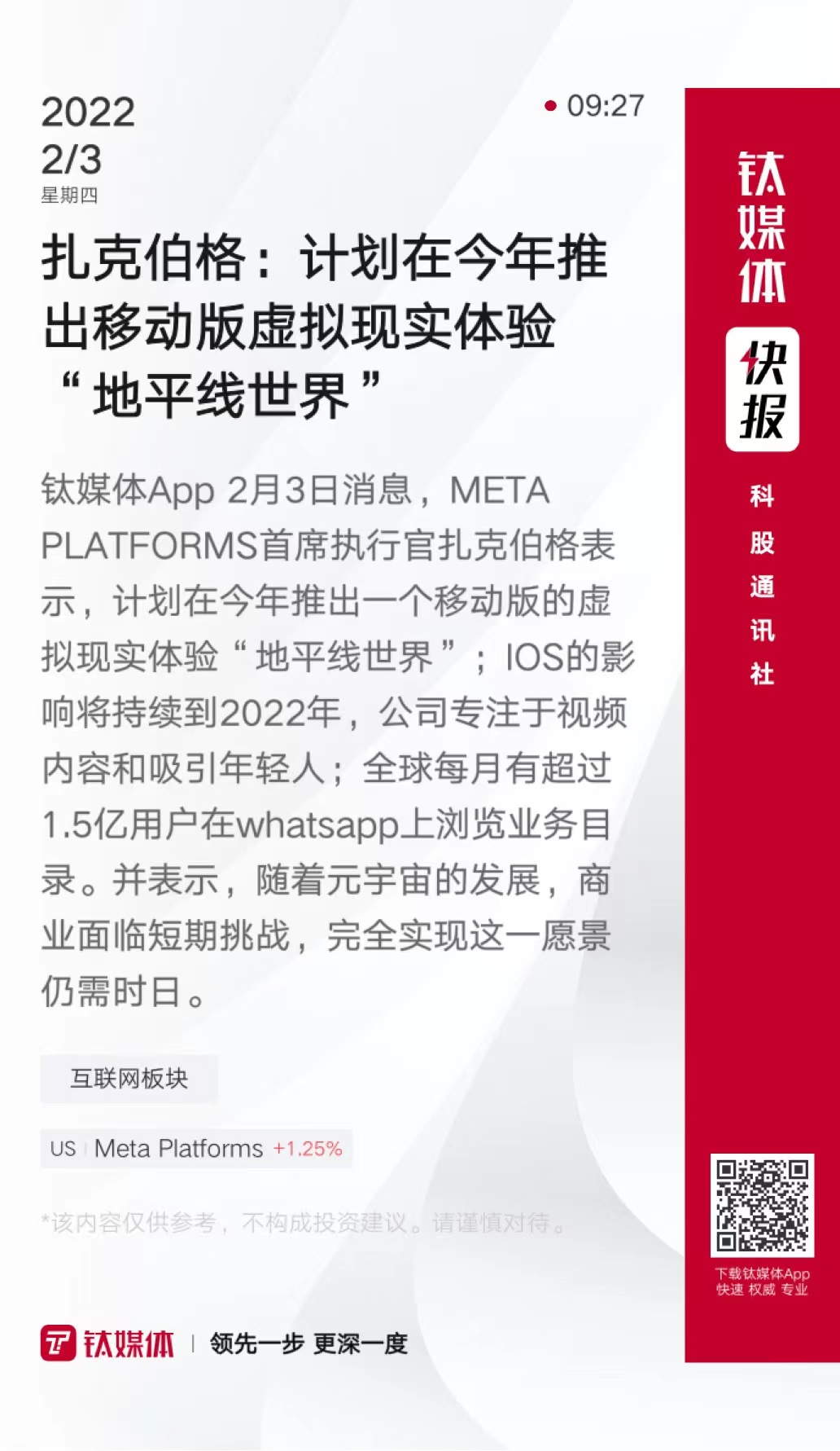 扎克伯格:计划在今年推出移动版虚拟现实体验“地平线世界”