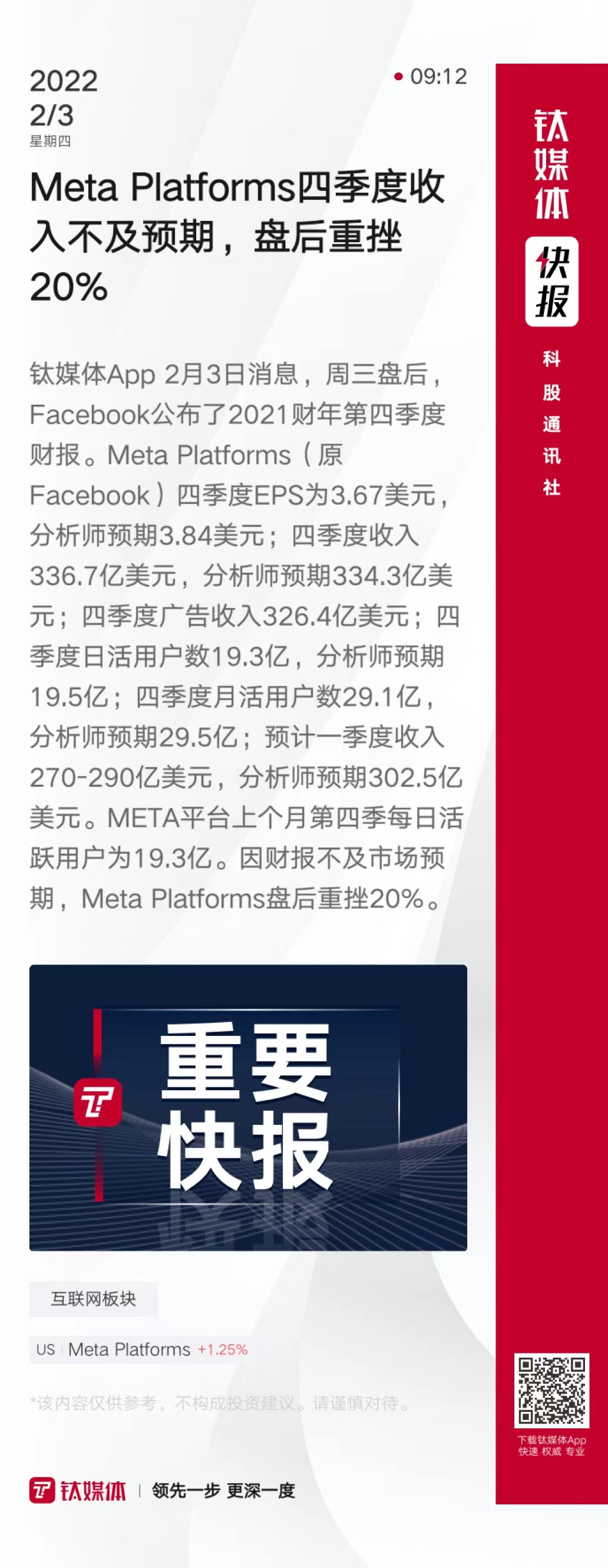 Meta Platforms四季度收入不及预期,盘后重挫20%