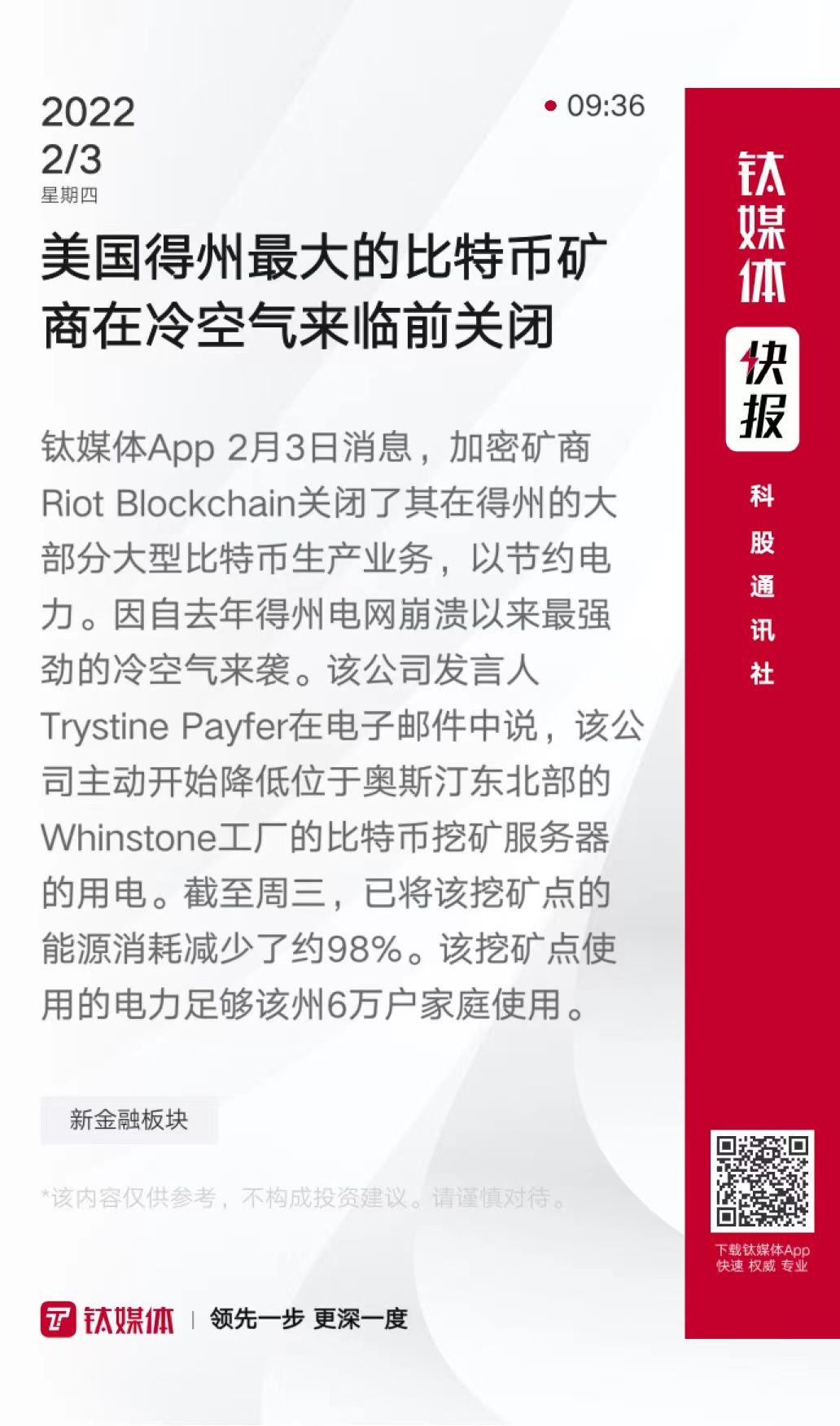 美国得州最大的比特币矿商在冷空气来临前关闭