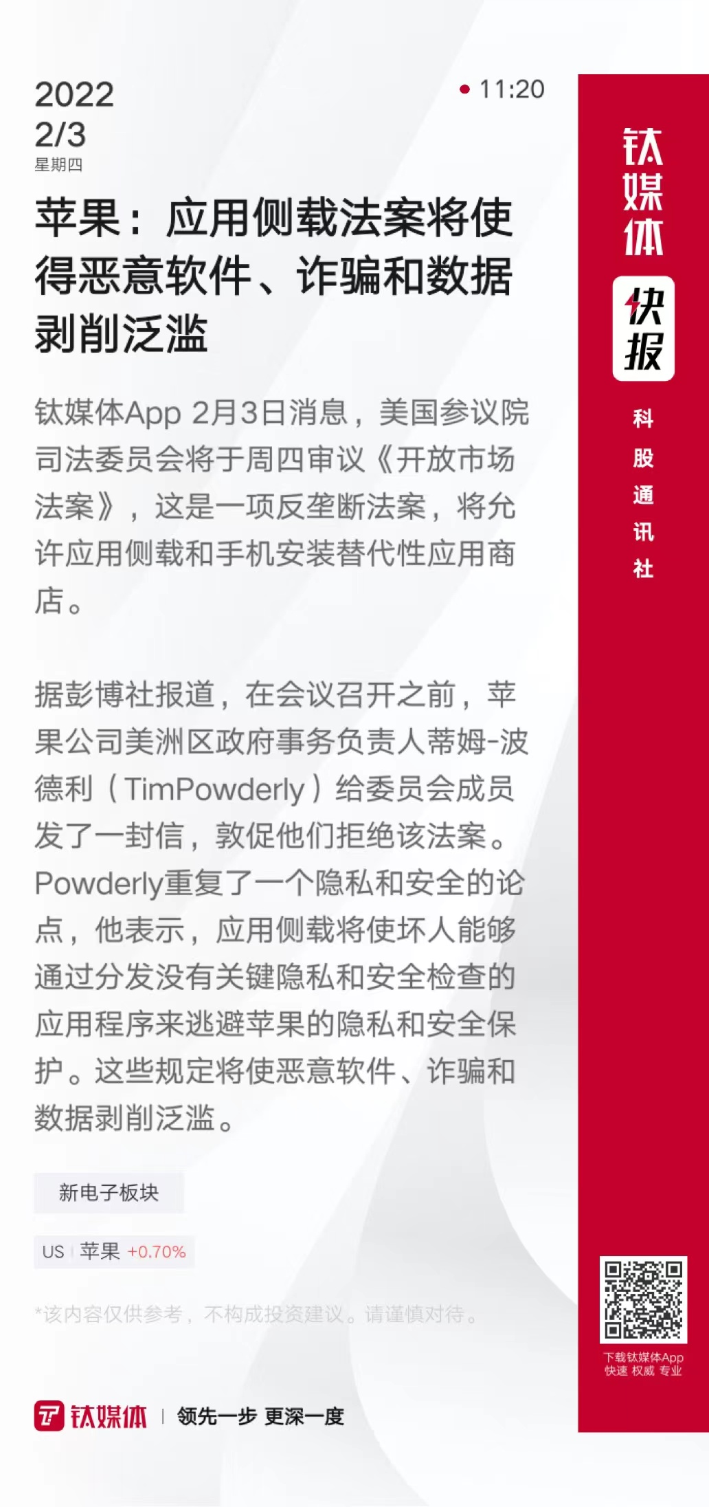 苹果:应用侧载法案将使得恶意软件、诈骗和数据剥削泛滥