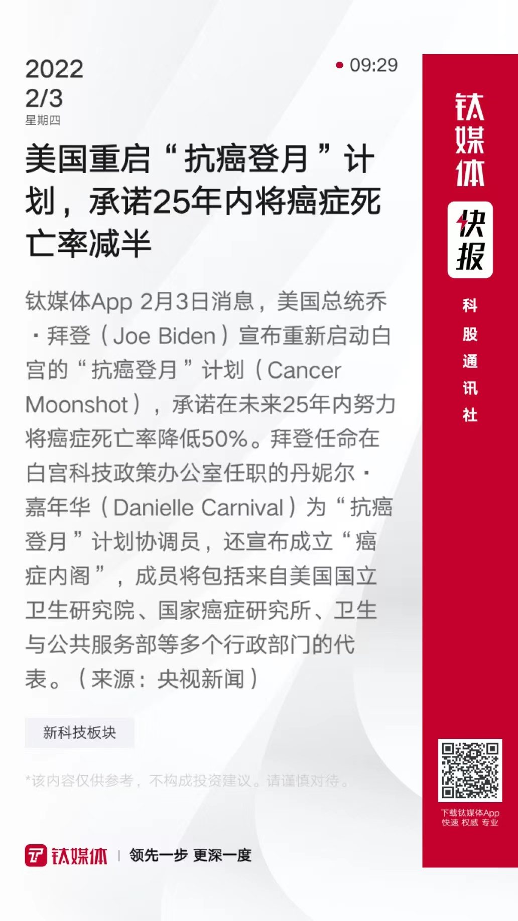 美国重启“抗癌登月”计划,承诺25年内将癌症死亡率减半