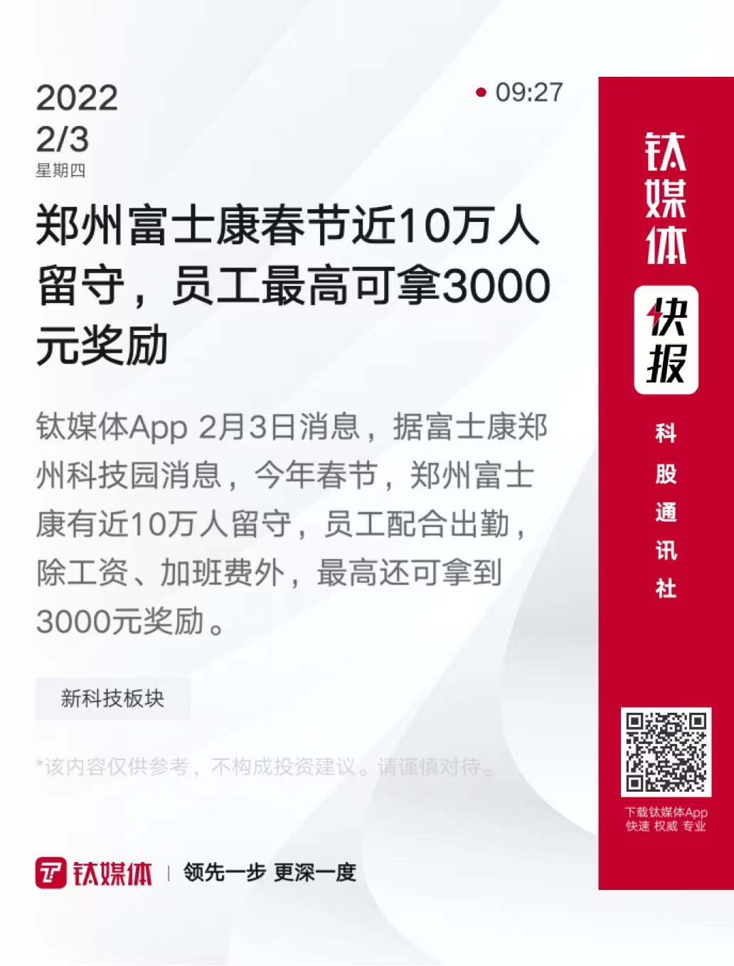 郑州富士康春节近10万人留守,员工最高可拿3000元奖励