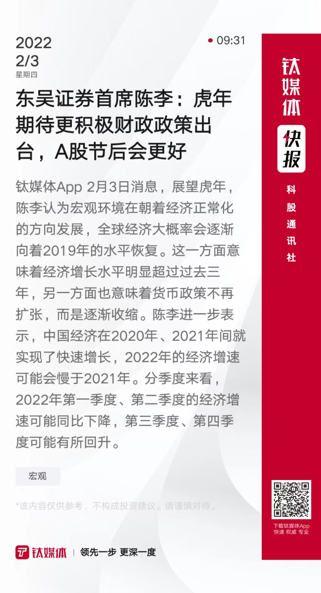 东吴证券首席陈李:虎年期待更积极财政政策出台,A股节后会更好