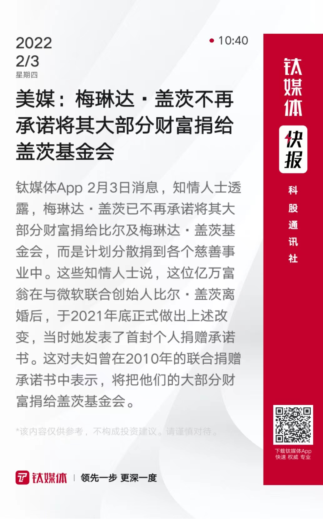 美媒:梅琳达·盖茨不再承诺将其大部分财富捐给盖茨基金会