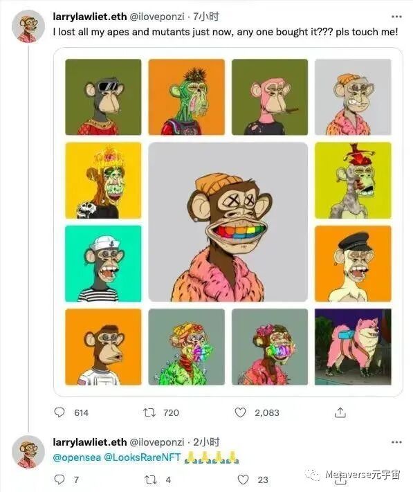 据中国证券报,2月1日,一位NFT收藏大户larrylawliet.eth在社交媒体表示,其持有的多只无聊猿猴游艇俱乐部(Bored Ape Yacht Club)、变异猿猴游艇俱乐部(Mutant Ape Yacht Club)以及Doodles NFT等系列价值不菲的NFT藏品被黑客盗取,希望知名NFT在线交易平台Opensea 以及LooksRare等能够施以援手。