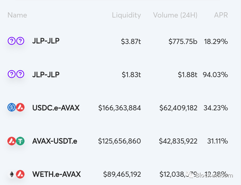 例如,在过去 24 小时内,TraderJoe USDC-AVAX 池收到了 15.6 万美元的交易费,支付给了 LP。鉴于该池的总价值为 1.66 亿美元,这对应于流动性提供者的年利率为 15.6 万美元 * 365 / 1.66 亿美元 = 34.2%。