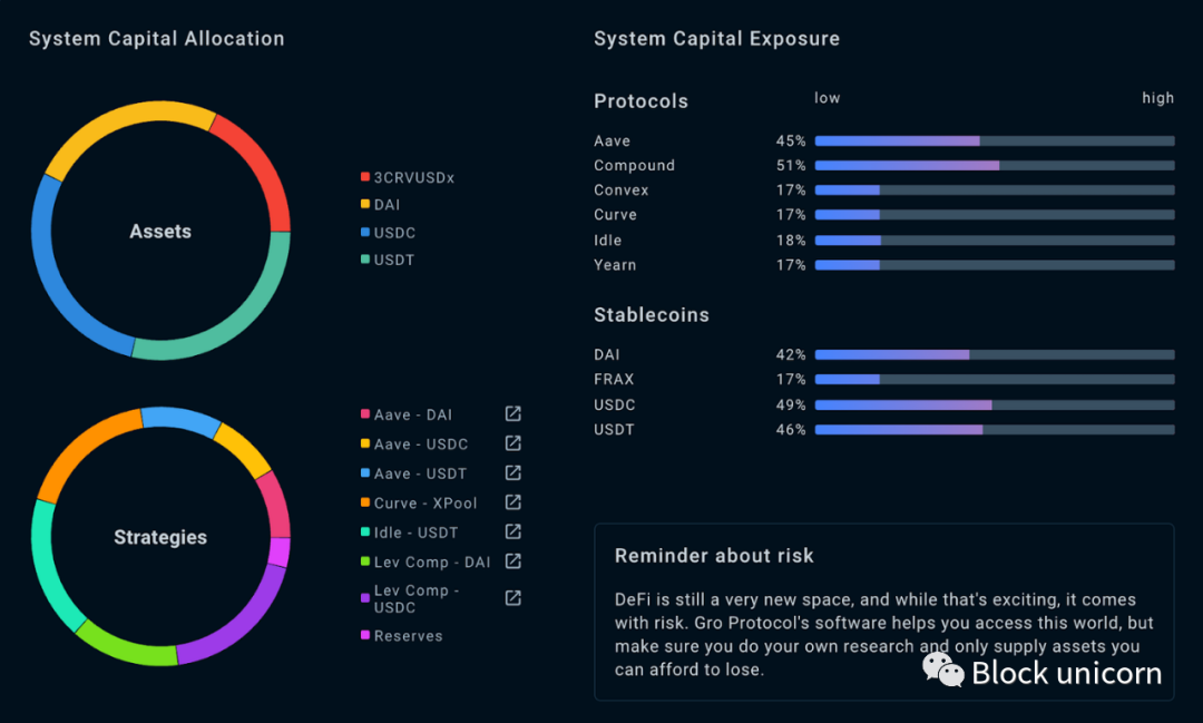 产量优化器的另一个很好的例子是Gro Protocol。[全面披露:我是 Gro Protocol 的去中心化营销部门 G-Force 的成员,并且未授予 GRO。] Gro 是一个风险分档的稳定币收益优化器,因此它接受 USDC、USDT 和 DAI 等资产。它将这些存入下游的许多不同协议中,以产生交易费用(即来自 DEXes)、借贷收入(即来自借贷池)和协议激励(即治理代币),并将它们清算回原始稳定币。