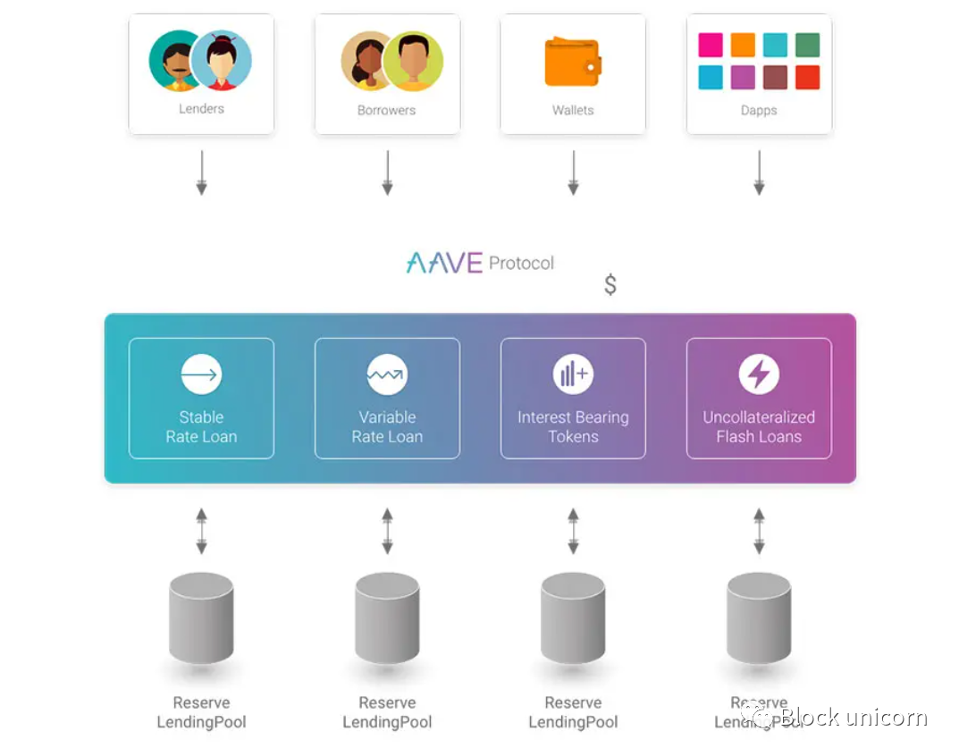 我们以AAVE为例。用户可以将他们的资金存入借贷池,并期望从中获得可变利率或固定利率。另一方面,借款人可以存入资产作为抵押品,并以抵押品的一定比例(抵押率)的价值从任何其他资产中取出贷款。只要抵押品的价值相对于贷款不低于某个阈值,贷款就保持“健康”,借款人有无限时间偿还贷款,包括利息。然而,当抵押品的价值低于阈值时,它会被清算(即变卖)并取消债务。