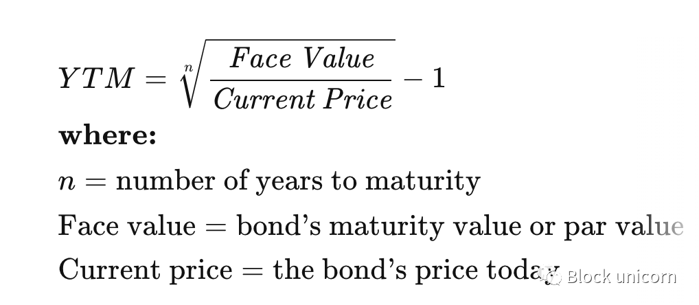 出于本文的目的,我们将收益率定义为财务状况预期产生价值的比率。这与 TradFi(传统金融)对债券 “ 到期收益率 ”(YTM)的定义大致一致,即债券在当前价格下达到面值的利率。从广义上讲,如果你持有 1.0 单位的价值,并将其存入一个收益率为 10% 的协议,那么一年后你应该期望拥有 1.1 单位的价值。