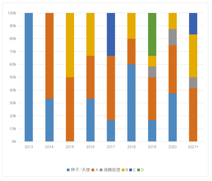 注:A轮包含Pre-A、A、A+,其他同理,战略投资均发生在种子/天使轮或Pre-A轮后;下同。