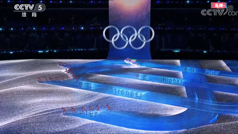 随后,四组滑雪运动员在场地上滑出浪波,“更快、更高、更强、更团结”这一奥林匹克格言在长长的滑冰轨迹上逐渐呈现。通过搭载京东方自主研发的超大规模显示模组控制与同步系统,地面可实时捕捉演员行进轨迹。![]()