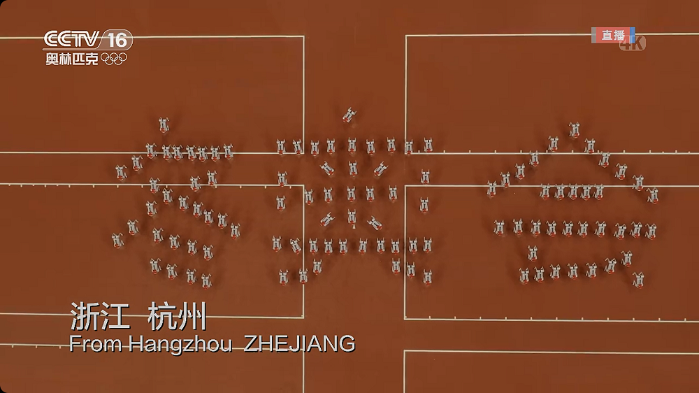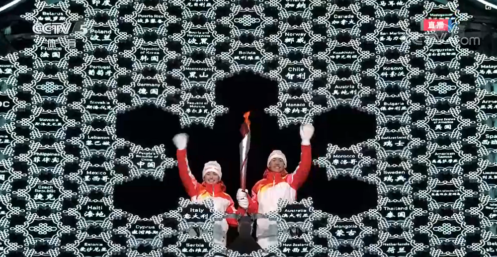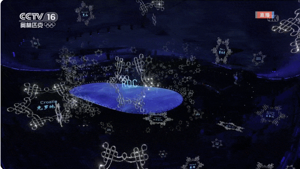 每个国家或地区的代表队入场时都有一个雪花形状的引导牌,在中国代表队入场后,引导员手拿雪花引导牌汇聚在一起,此时虚拟的雪花也开始显现。![]()