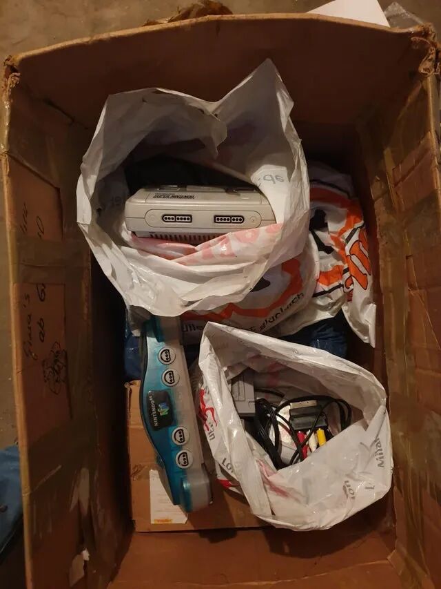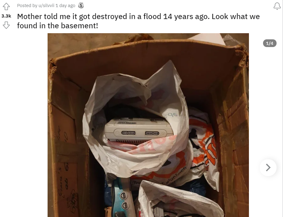 reddit用户silvvii发帖表示,他的妈妈告诉他,用来装游戏机的箱子早在14年前的一场水灾中被毁。不过时至今日,他在家里的地下室偶然发现了当年的宝贝游戏机,从图上看有超任、N64、PS2,还有一些游戏卡带。
