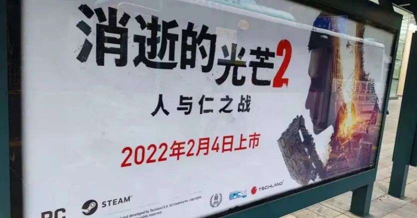 【《消逝的光芒2》街头广告引争议】 国内某公交站广告牌出现了《消逝的光芒2》的广告,有网友对其无版号做宣传的行为提出了质疑,称不符合广告法。据悉,这一部作品在Steam上的同时在线人数峰值是前作的数倍。