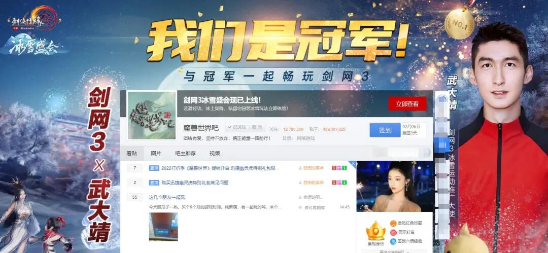 【《剑网3》包贴吧广告庆祝冬奥首金】 中国拿到冬奥首金后,永劫无间、FF14、倩女OL、天涯明月刀OL、新天龙八部、网络游戏、魔兽世界、逆水寒OL、剑灵等贴吧出现“剑网3庆祝武大靖夺冠”广告大图,据游戏日报了解,武大靖担任了《剑网3》最新版本推广大使。