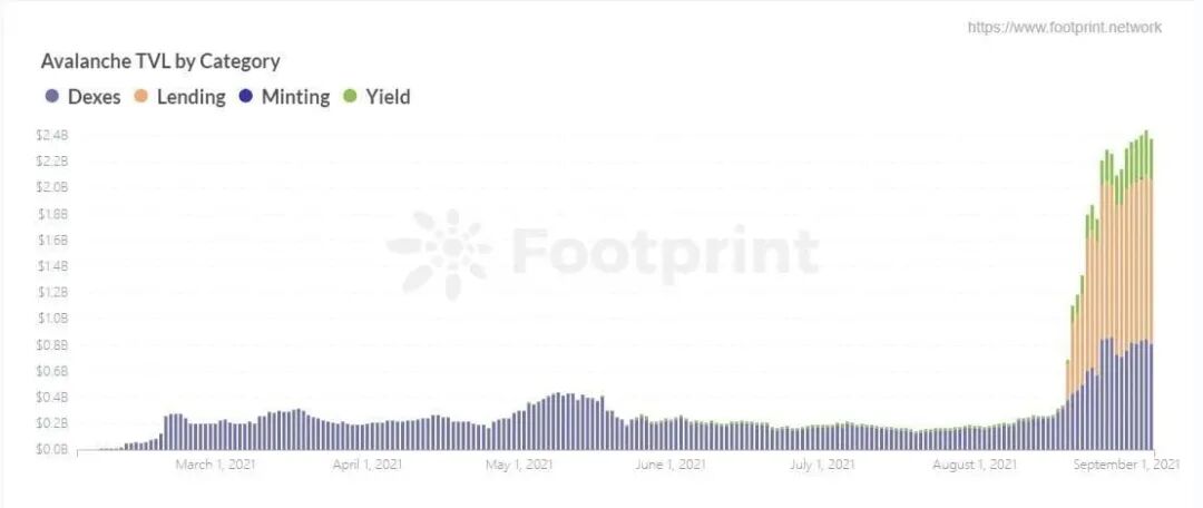 Avalanche链不同类别TVL(自2021年1月),数据来源:Footprint Analytics
