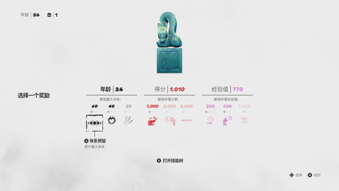 这是一种收益和风险都非常明显的死亡机制。一方面来说,玩家在角色死亡后,不必重启关卡,而是原地复活继续挑战,加上70多岁的年龄上限,有着足够多试错的机会,而且每一次死亡后,玩家都有机会学习新技能,生命值虽然会降低但攻击力也会上升,理应是一种越死越强的状态。