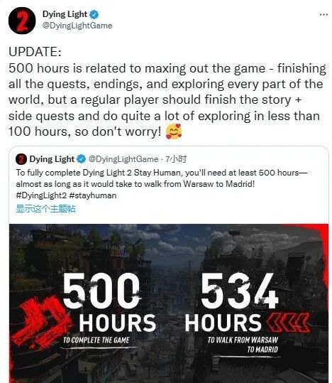 显然,Techland 对此次作品的大火烹调胸有成竹,不过消息放出时似乎引起了一些玩家的误会——omg,500小时?玩家看了直摇头,还有部分玩家在官推下表示了强烈不满,官方随即补充道,500小时是为极限探索、收集党准备的,而对普通玩家来说,完成主线、支线任务及大量的游戏世界探索大约在100小时以内。