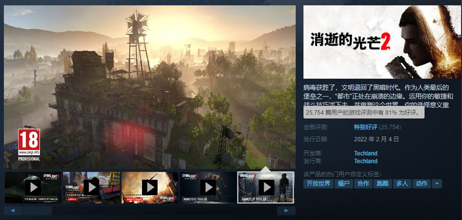 此外,续作还延续了一代作品的多数优点并对其进行了版本升级,不管是玩法、探索还是各种挑战都变得更为过瘾。《消逝的光芒2》支持简中,国区售价299元,目前有着81%的好评率且在线玩家数峰值超过了27万,据悉,V 社日前公布的2022年2月第一周 Steam 销量排行榜中《消逝的光芒2》强势登顶,同时其各个版本还占据了前十的大半江山。