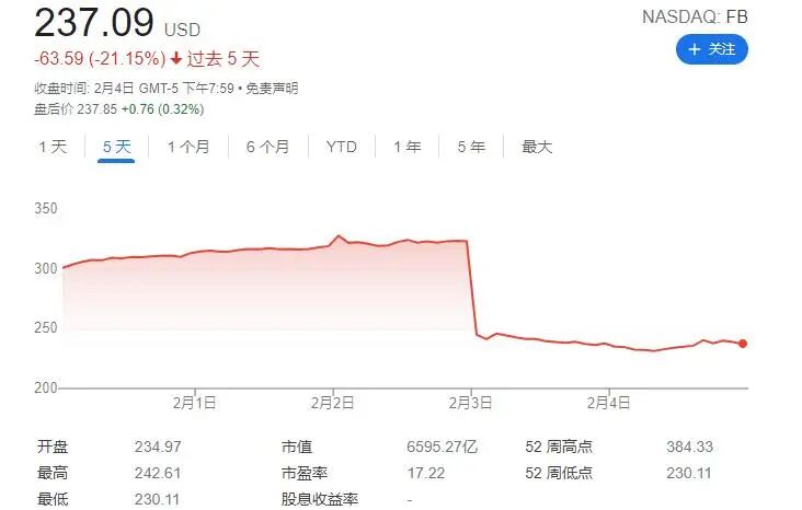 如此令人大跌眼镜的表现,自然也会遭到资本市场的“现世报”。在财报公布的当日,Meta股价即暴跌26%,创下美股市场Meta公司历史最大市值跌幅,单日市值损失超过2370亿美元(约合1.5万亿人民币)。这一跌幅大幅刷新了苹果在2020年9月创造的1820亿美元(约合1.15万亿人民币)的跌幅。