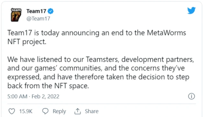 此前,曾与Team17合作过的游戏工作室Aggro Crab表示,如果Team17不取消NFT计划,它将不再与其进行合作。随后又有两家游戏公司发布了永不涉足NTF的声明并收获了大量网友的点赞。此外,网友甚至还创建了一个话题#TeamNoNFT ,以此表达对Team17的NFT计划的不满。在玩家和合作伙伴的集体炮轰下,Team17当日宣布放弃NFT计划。