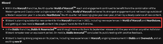 近日,在暴雪官方报告中,关于《魔兽》手游的消息再次被提及,暴雪表示在2022年将会首次为玩家带来《魔兽》手游的全新内容,同时还有《魔兽》和《炉石》的最新内容和体验。考虑到此前已经有消息爆料暴雪有一款全新IP的游戏已经开发多年,《OW2》和《暗黑4》也已经处于等待发售之中,再加上确定以及不确定的多款手游,暴雪似乎又行了?