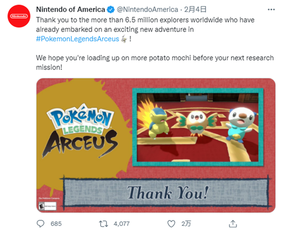 任天堂表示,“《宝可梦传说:阿尔宙斯》自1月28号发售之后,全球已经有超过650万玩家开始了激动人心的冒险”。值得一提的是,本作也成功刷新NS平台《宝可梦》销量最快的记录。