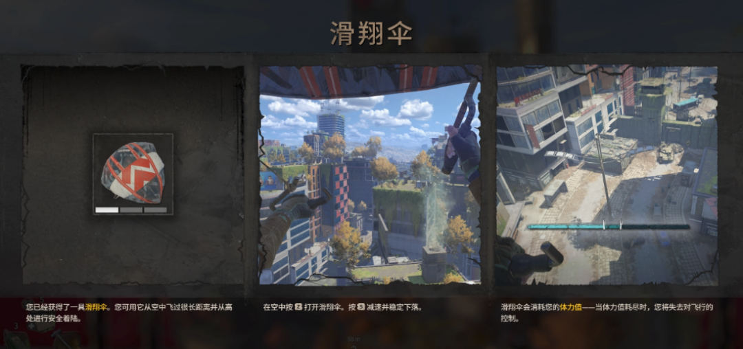 例如滑翔伞与爪钩。滑翔伞能让玩家滑翔很长一段距离,从而飞至距离较远的建筑物,或者在坠落时降低速度安全着陆。