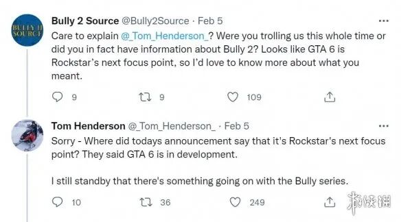 有网友在推特上质问Tom Henderson:看起来GTA6是R星下一个关注焦点,你之前关于《恶霸鲁尼2》的消息是不是耍我们?Tom Henderson回应说:“不好意思,今天的官宣消息里哪里提到R星的‘焦点’了?他们只是说GTA6正在开发。我依旧坚持认为目前有一些围绕《恶霸鲁尼》系列的事情发生。”