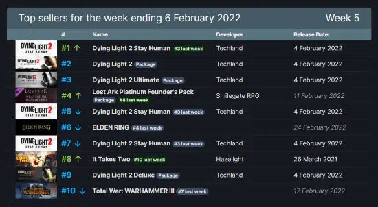 Steam公开了上一周(截至2月6日)的销量排行,前三名由近日发售《消逝的光芒2:坚守人性》夺得;第四名由《穿越火线》制作商Smile Gate研发的MMORPG游戏《失落方舟》铂金创始人包获得。