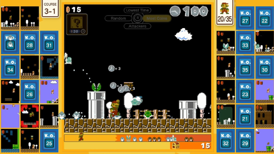和上面提到的《3D收藏辑》一样,本作是老任为庆祝马力欧35周年而制作的完全免费游戏,所有玩家都可以免费下载。但由于本作是一款多人联机游戏,因此只有开通了NS Online的玩家才可以实际上手游玩。在本作中我们可以玩到FC上初代《超级马力欧》中的一系列关卡,房间里的35位玩家各玩各的,但也能通过游戏中的一些操作给其他玩家造成伤害,谁能活到最后谁就是最终的赢家。由于本作是限时纪念作品,现在已经在eShop下架,并且服务器也已经关停。即使之前下载过本作的玩家,现在打开游戏也只会提示无法游玩。只剩下一个图标可以看了![]()
