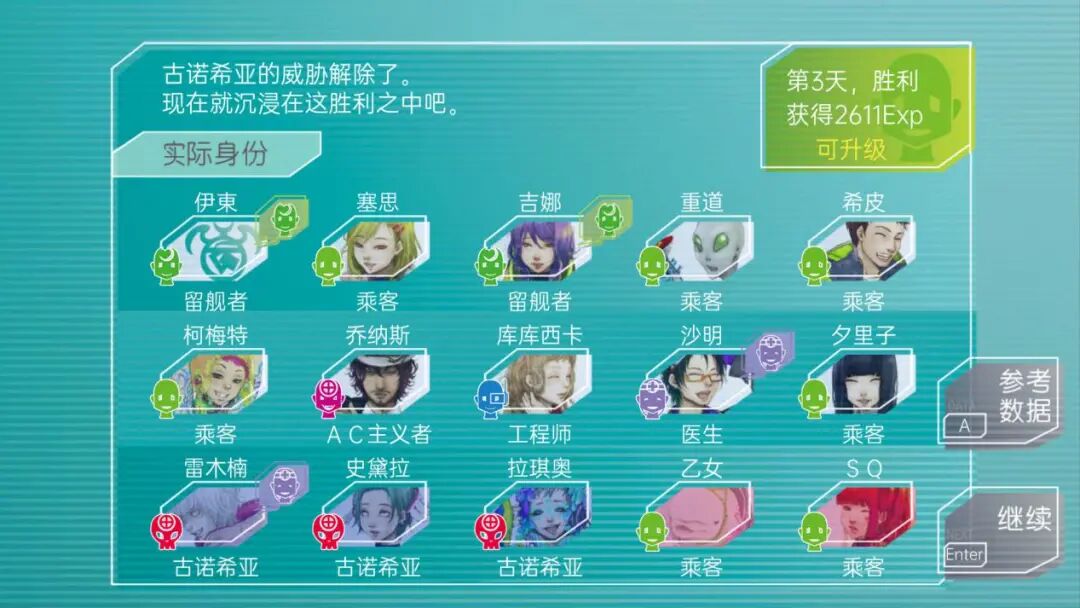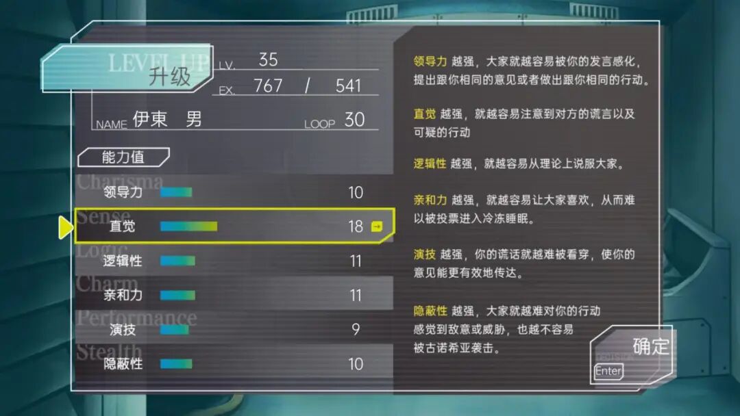 在每次轮回后,系统会为玩家发送相应的经验值作为奖励,玩家可以将这些经验值分配给自己的各项能力上,比如能够轻松带节奏的“领导力”,让自己不容易成为古诺希亚目标的“隐蔽性”,或是容易在对方说谎时,获得额外信息的“直觉”。