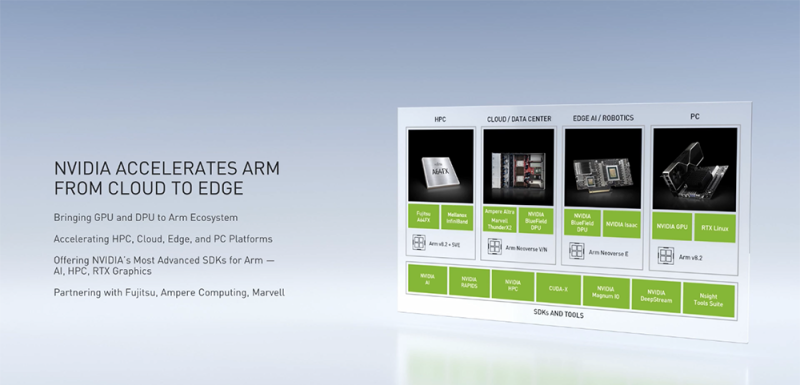 对于FTC的起诉,英伟达、Arm和软银则联合发布了长达49页的辩护书,强调Arm当前正在面临越来越高的研发成本,但由于Arm在移动处理器等主要市场的份额基本饱和,其IP授权和版税收入难以快速增加,面临着强大的竞争压力。而对于英伟达来说,它没有动机阻碍技术创新和不公正对待Arm客户。相反,英伟达认为双方的合并将加速人工智能等新技术的发展。除了不停强调Arm的独立和开放外,借收购东风,英伟达开始全面布局Arm生态。在2020年交易公布一个月后的GTC大会上,黄仁勋宣布在三个方面进行投资,包括将包括将GPU和DPU迁移到Arm生态上、加速高性能计算与云边端平台、向Arm提供英伟达AI、HPC、RTX引擎等先进SDK。![]()