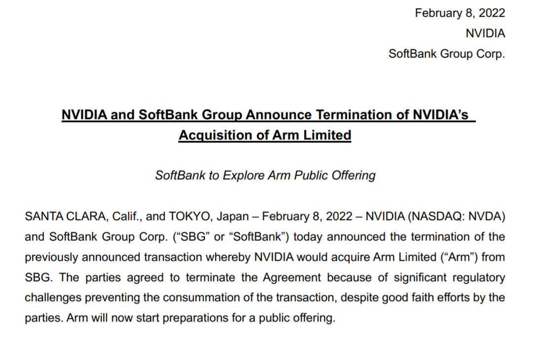 今日下午,英伟达、软银正式宣布交易失败,软银将保留此前12.5亿美元的定金,并帮助Arm筹备上市事宜。而英伟达则将保留20年的Arm授权。英伟达和软银集团今天宣布,终止先前宣布的英伟达从软银收购Arm的交易。尽管双方做出了善意的努力,但由于监管方面的重大挑战阻碍了交易的完成,双方同意终止协议。Arm现在将开始准备公开募股。“Arm拥有光明的未来,我们将在未来几十年继续以自豪的被许可人身份支持他们。”英伟达创始人兼首席执行官黄仁勋表示,“Arm是计算领域重要动态的中心。虽然我们不会是一家公司,但我们将与Arm密切合作。孙正义进行的重大投资使Arm能够将Arm CPU的范围从客户端计算扩展到超级计算、云计算、人工智能和机器人技术。我预计Arm将成为未来十年最重要的CPU架构。”软银今天还宣布,将与Arm合作,开始准备在2023年3月31日结束的财政年度内让Arm公开发行(IPO)。软银相信Arm的技术和知识产权将继续成为移动计算和人工智能的发展。软银董事长兼首席执行官孙正义谈道,Arm不仅正成为移动计算革命的创新中心,还在云计算、汽车、物联网和元宇宙等领域成为了创新中心,已进入第二个增长阶段。孙正义继续说道:“我要感谢黄仁勋和他在英伟达才华横溢的团队,他们努力将这两家伟大的公司聚集在一,并祝他们一切顺利。”英伟达和软银此前已宣布达成最终协议,根据该协议,英伟达将于2020年9月13日从软银收购Arm。由这一收购协议条款,软银将保留英伟达预付的12.5亿美元,将在第四季度入账成为公司利润,英伟达则将保留20年的Arm授权。