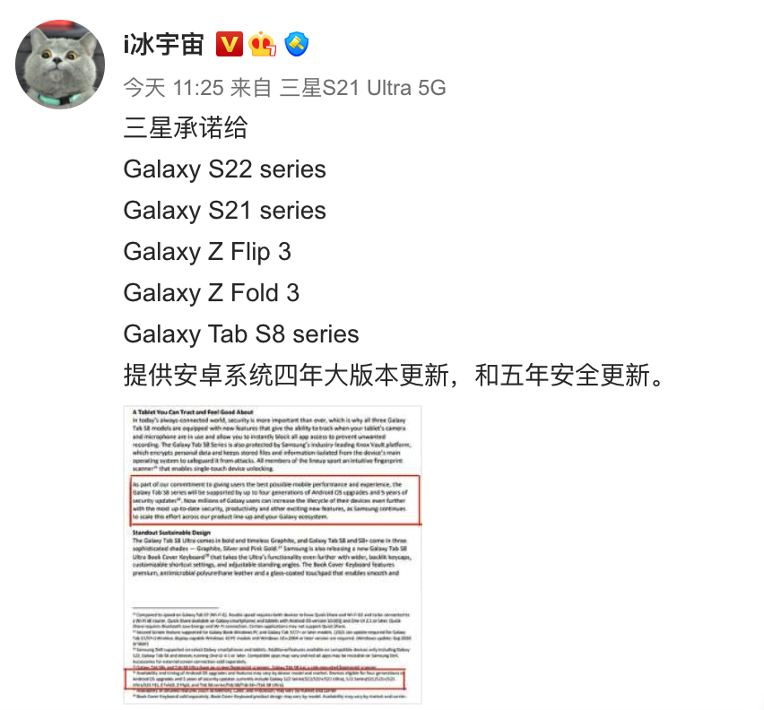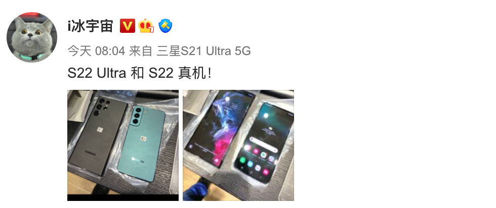 按照爆料中显示的信息,这次活动中全新的Galaxy S22系列手机、Galaxy Tab S8 系列平板将正式亮相。现在,距离官方宣布的新品发布时间还有一天,相关的产品爆料也开始大量出现在了网络上。以往的消息中曾显示了全新Galaxy S22系列手机的外观渲染图,现在最新的消息则展示了疑似的真机照片。据悉,最新的消息来自博主@i冰宇宙,这位博主展示了Galaxy S22和Galaxy S22 Ultra的真机照片。结合图片来看,真机外观设计与以往的渲染图爆料基本保持了一致。Galaxy S22的机身设计延续了上代产品的外观思路,摄像模块由机身一侧延伸至边框;Galaxy S22 Ultra则在S系列一贯风格的基础上,结合了Galaxy Note 20 Ultra的设计风格。其中,Galaxy S22 Ultra的整体机身轮廓与 Note 系列的方正风格接近,并没有采用统一的后摄模块,而是将镜头组件单独安置在了机身后壳上方。正面屏幕部分,全新的Galaxy S22和Galaxy S22 Ultra都采用了中置打孔设计,并结合四周窄边框方案,带来不错的视觉体验。其中,Galaxy S22 Ultra配备的目测是一块曲面屏,这也是目前高端旗舰经常选择的方案;Galaxy S22则配备了一块直屏,而这则是不少用户在实际使用中多次提到的需求。来自同一位博主的消息还显示,“三星承诺给Galaxy S22 series Galaxy S21 series Galaxy Z Flip 3 Galaxy Z Fold 3 Galaxy Tab S8 series提供安卓系统四年大版本更新,和五年安全更新。”同时,随着新机发布活动的接近,最近也有消息曝光了全新三星Galaxy S22系列的疑似定价。按照爆料中提到的说法,Galaxy S22系列的起售价将在799美元(约合人民币5080元)左右。与之对比,上代三星Galaxy S21系列的起售价也是799美元。如果这一说法准确的话,那么推测其国行版本的最终售价也存在与前代持平的可能。而Galaxy S21的国行版本起售价则为4999元(8GB+128GB)。综合目前的消息,全新Galaxy S22系列的外观、规格、定价都出现了爆料信息。实际的新品表现如何,就需要等待后续的发布活动了。![]()