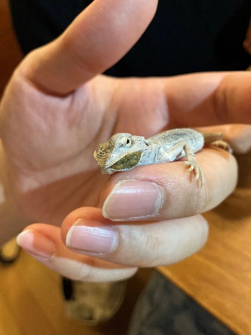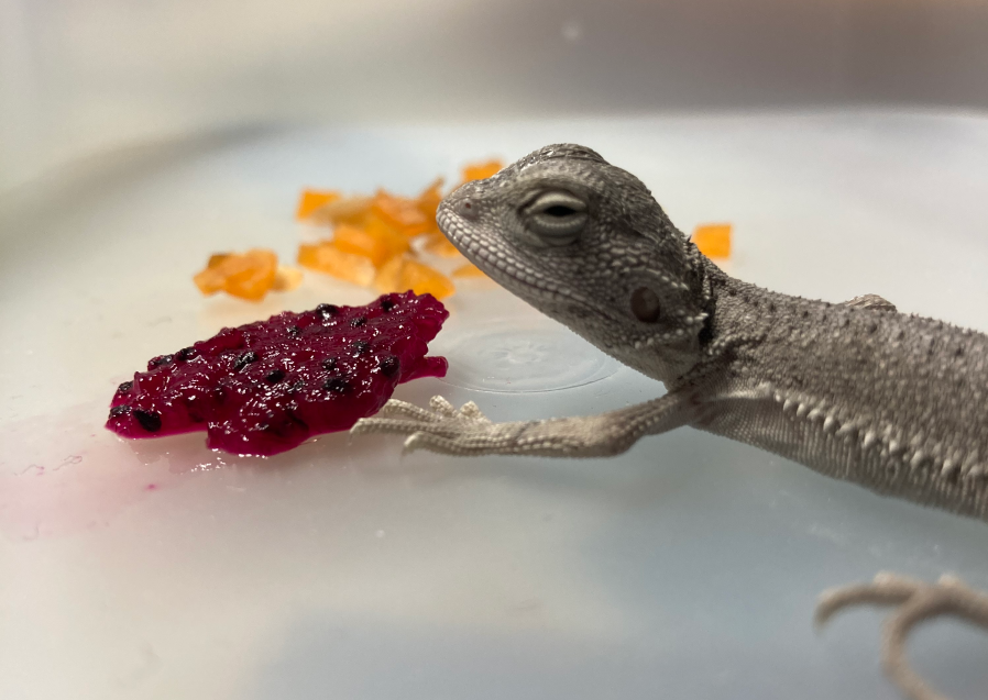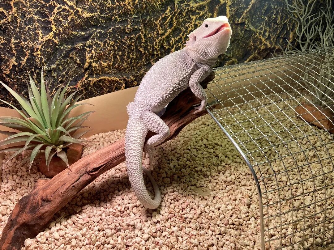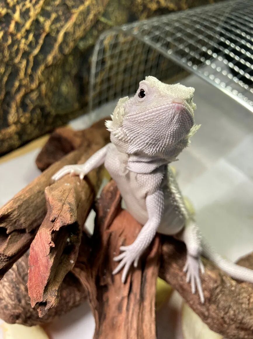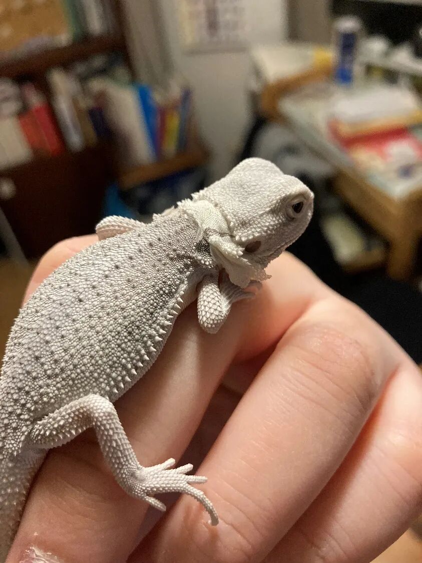 和食欲好的人类一样,白白里吃什么都开心,生菜、蟑螂、凝胶,见到就吃,简直和鱼一样不怕撑死。蜥蜴的蜕皮意味着成长,每次蜕去旧皮,都能比原来大那么一点。1个月内,白白里就已经全身蜕皮两次,从刚来的25厘米长到了30厘米,身上的鳞甲也越来越白皙漂亮。