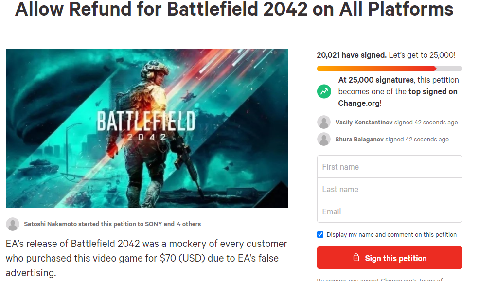 一片狼藉,凉到不行的《战地2042》,近日又有大批玩家相聚一堂,怒斥EA虚假宣传、无视承诺,要求退款。在国外的请愿网站Change上,有玩家发起了“要求《战地2042》开启全平台退款”的请愿,而且总的签名人数目前已经超过了17000人。同时发起人还在介绍中写道,只要签名人数超过5万,他们就会找来最好的律师提起诉讼。反正一句话,绝不能惯着他!