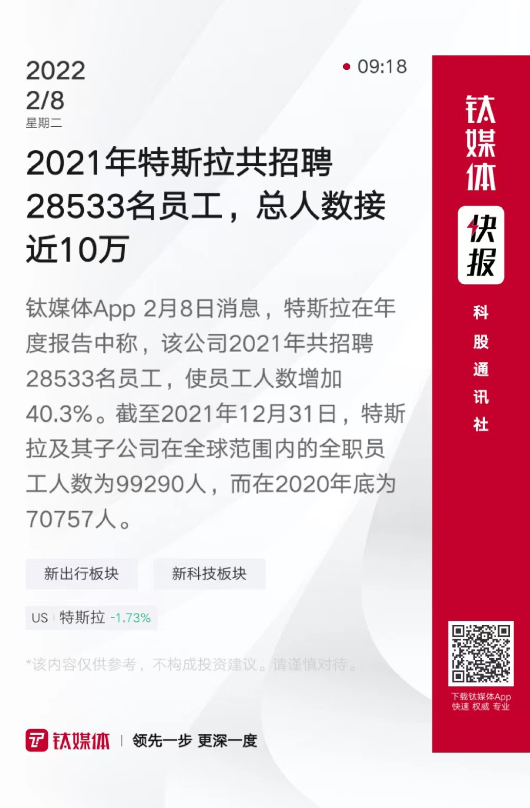 2021年特斯拉共招聘28533名员工,总人数接近10万