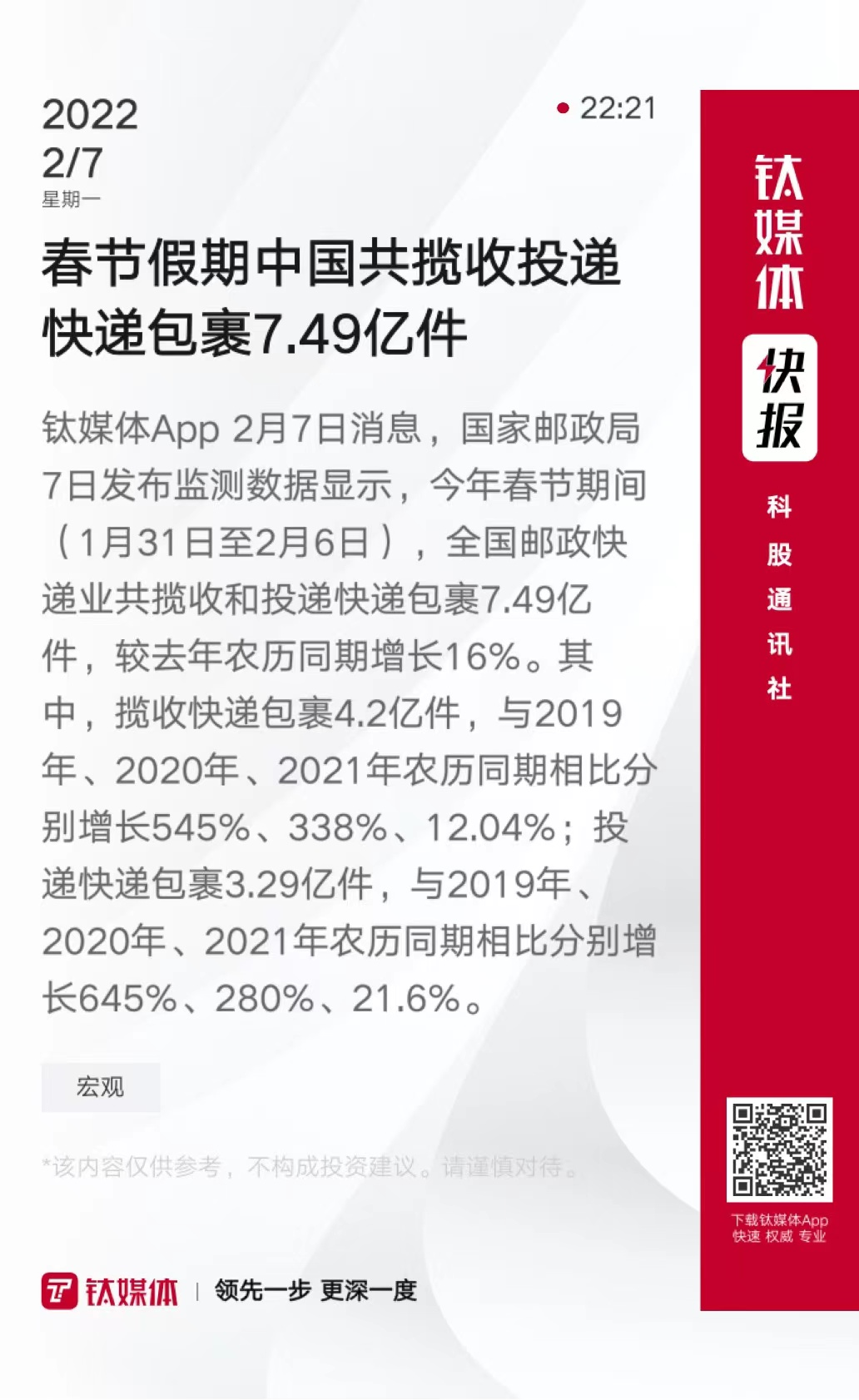 春节假期中国共揽收投递快递包裹7.49亿件
