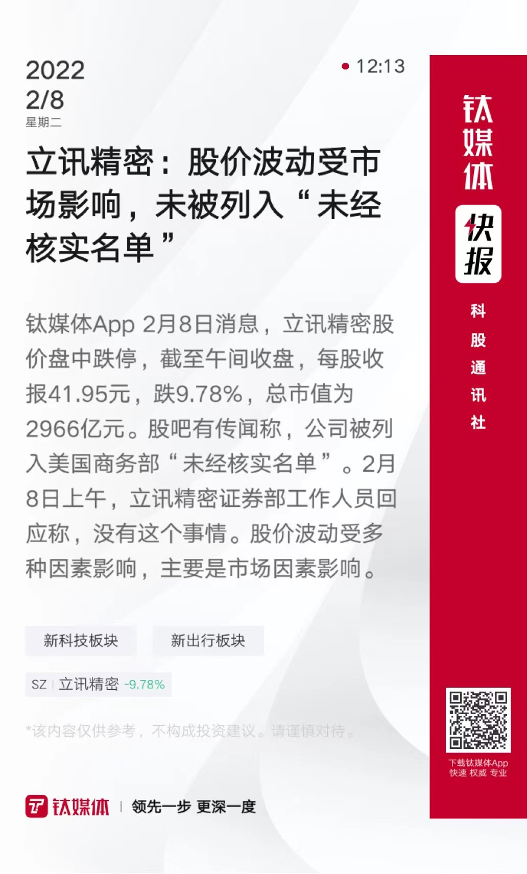 立讯精密:股价波动受市场影响,未被列入“未经核实名单”