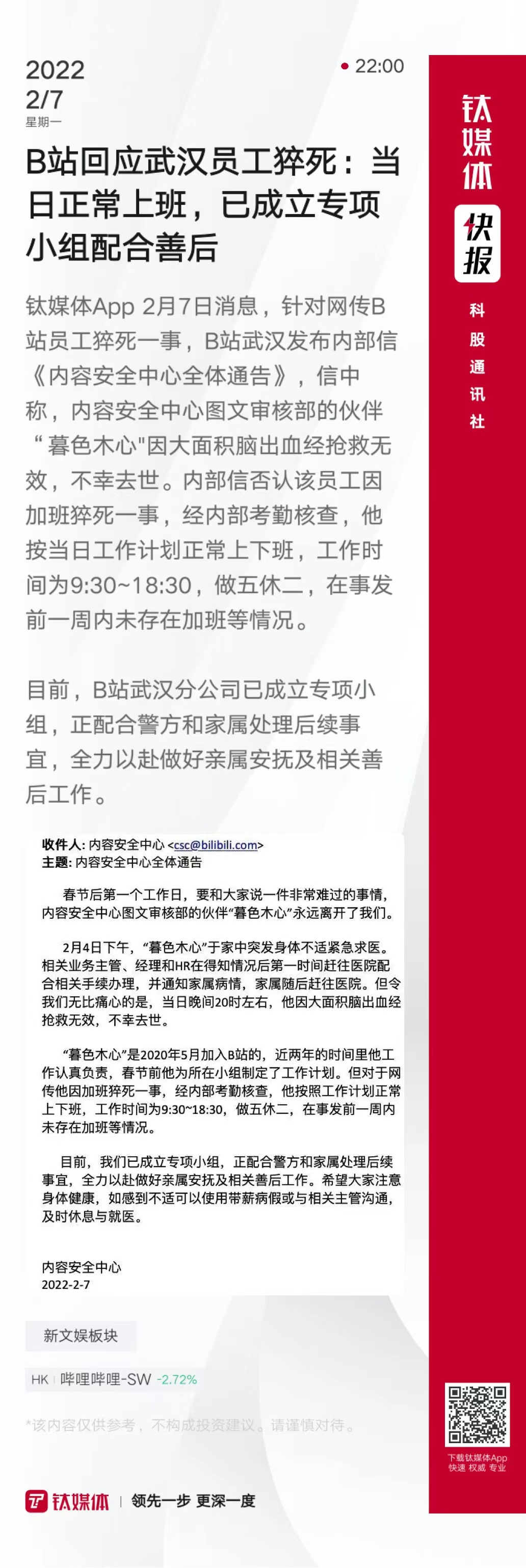 B站回应武汉员工猝死:当日正常上班,已成立专项小组配合善后